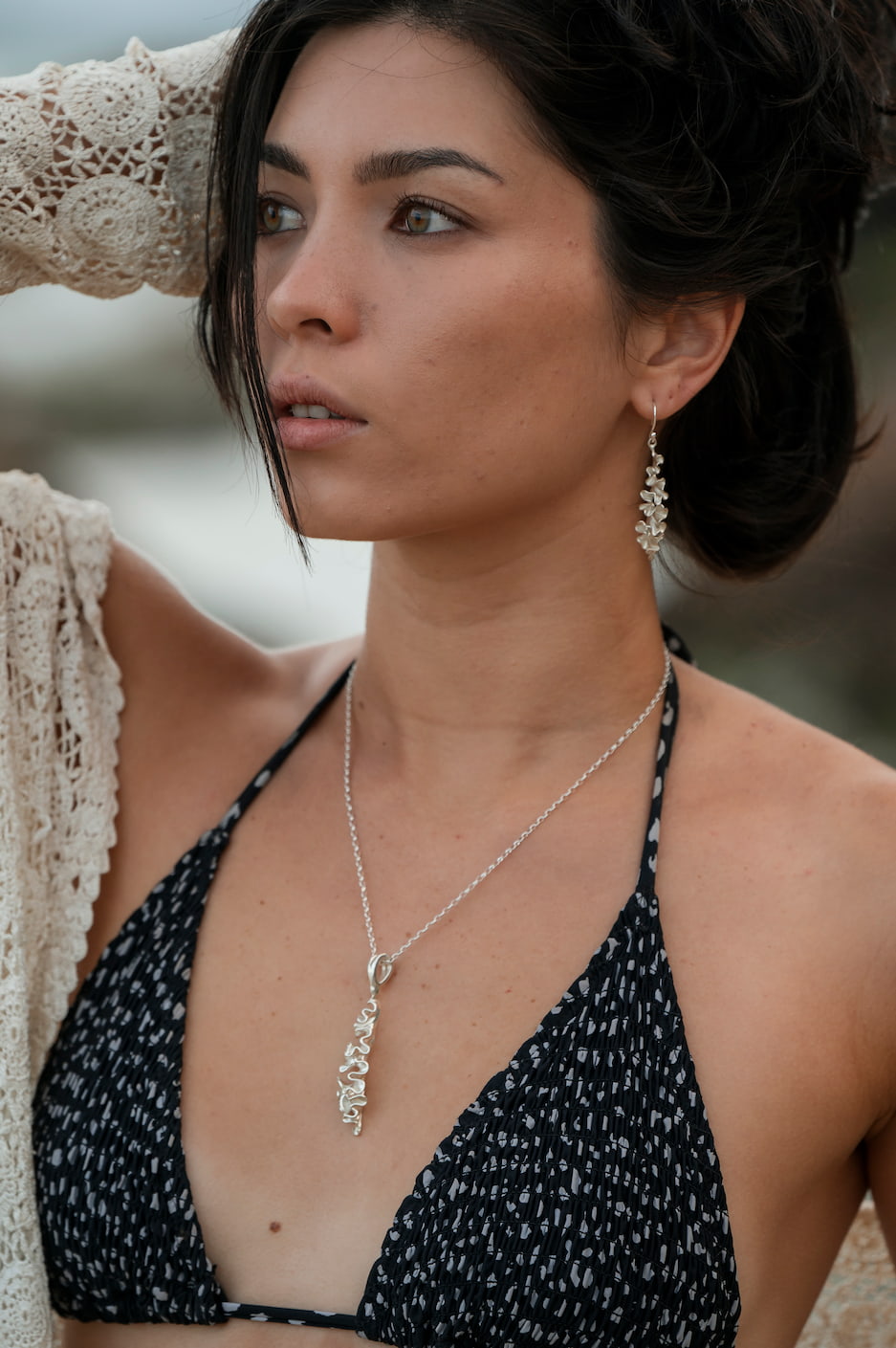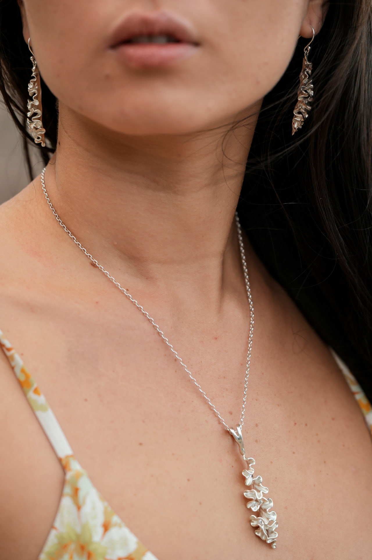 Inspired by the gentle sway of ocean seaweed, this pendant echoes the same delicate, twisting design as the earrings. Detailed on all sides, it captures the natural curves and textures of underwater life. Its versatile size makes it perfect for layering or wearing solo, and it pairs beautifully with the Seaweed Earrings to bring a cohesive, flowing style to your outfit.